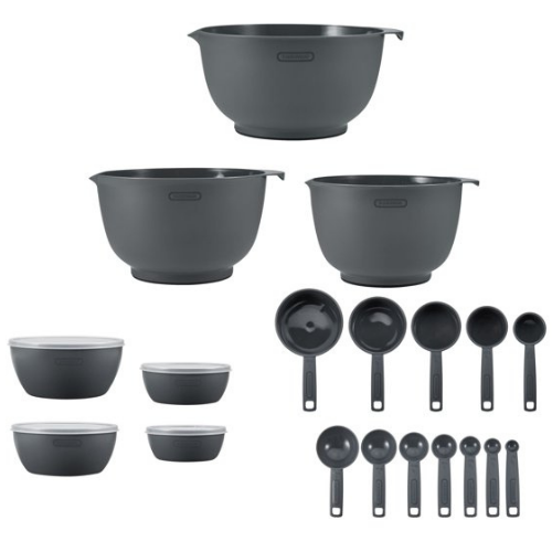 - 23-piece set includes: 3 mixing bowls, 4 prep bowls with 4 lids, 5 measuring cups, and 7 measuring spoons