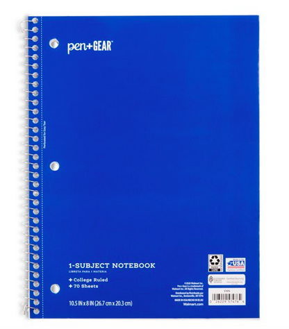 Pen+Gear 1-Subject Notebook, College Ruled, Blue, 70 Sheets – $0.35