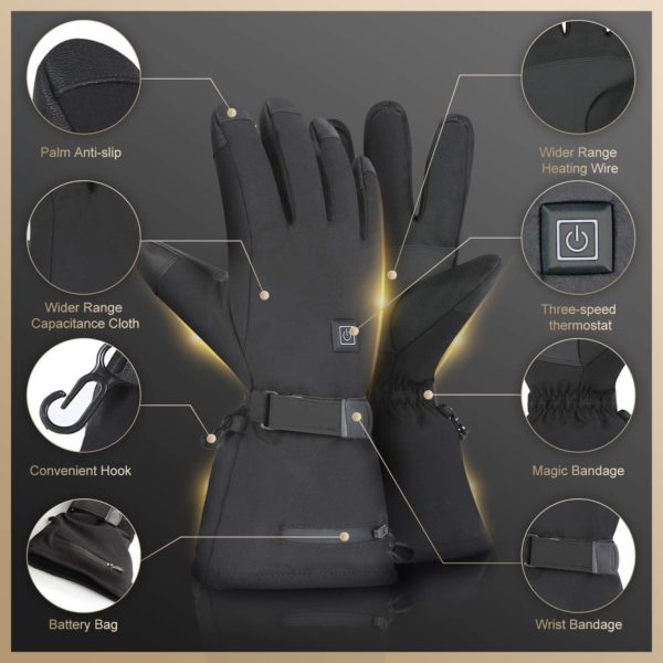- FAST HEATING— The heated gloves have built-in heating elements, which cover the fingertips and palms. The maximum heating temperature is 140°F(60℃. And the whole glove is made of 3M cotton, which can keep warm better and reduce heat loss. The surface of gloves is also made of windproof and waterproof fabric, which can block cold wind and water.