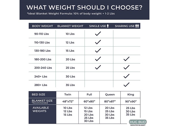 The kids blanket is only available in gray and weighs 5 lbs. The adult blanket comes in two colors, gray or navy, available in your choice of 10-30 lb. weight, ranging in size from 48″ x 72″ to 90″ x 90″. Takes a look at the chart below to find out what weight is best for you.