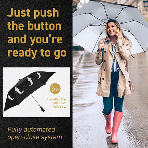 • Windproof – Our compact umbrella includes a double canopy that allows air to pass through without letting the rain in, while the non-slip handle prevents it from flying out of your hands