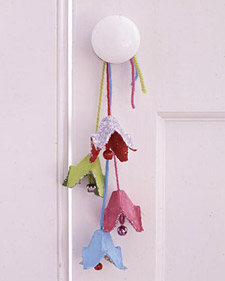 Make sure you save your empty egg cartons for this next one.  Now we’re making doorbells from Martha Stewart. Cut out the cone shapes from the egg carton and have your kids paint them however they’d like. Put some glue on the edges and sprinkle glitter over the glue.  Then thread a bell onto some yarn, poke a hole through the top of the cone, and leave enough string at the top to tie around the door knob.