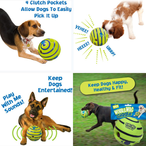 • WOBBLE WAG GIGGLE Ball With just the nudge of a nose, off the ball goes! Wobble Wag Giggle does not require batteries – the secret is the internal tube noisemaker inside of the ball, the enticing “play-with-me” giggle sounds are sure to engage your pup as the toy rolls around!