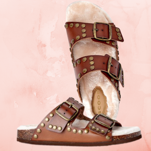 - Scoop Studded Faux Shearling Double Strap Sandals