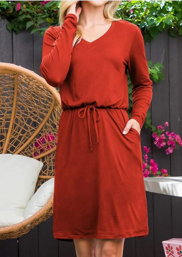 Solid Long Sleeve Cinch Waist Pocket Dress | S-3X